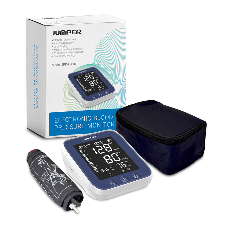 فشارسنج بازویی جامپر مدل JPD-HA101 دارای تاییدیه های پزشکی CE اروپا, FDA امریکا, مدیریت کیفیت تجهیزات پزشکی جهانی MDD93/42/EEC برای دستگاههای پزشکی و مجوز های قانونی زیر نظر اداره تجهیزات پزشکی کل ایران (IMED) است. این دستگاه دیجیتال با دقت بالا در اندازه گیری فشار خون, ضربان قلب و هشدار اریتمی می باشد. این دستگاه دارای 99 حافظه داخلی برای استفاده 2 کاربر به صورت مجزا است و دارای یک مانیتور LCD خیلی بزرگ با قابلیت بَک لایت (روشنایی اعداد در محیط تاریک) است و فشارخون را به شکل دیجیتالی در زمان کوتاه و دقت بالا و کاملا خودکار محاسبه میکند. کاف این فشارسنج بازویی، مناسب دور بازو 22 تا 36 سانتیمتر است و در صورتی که بازوبند اشتباه بسته شود دستگاه اخطار میدهد ( قابلیت cuff detection). شما میتوانید فشار ماکزیمم و مینیمم و تعداد ضربان قلب را به صورت جداگانه و میانگین نتایج را در دستگاه مشاهده کنید. منبع انرژی این دستگاه دوگانه از طریق باتری و برق شهری (از طریق کابل MicroUSB) تامین میشود و دارای قابلیت خاموش شدن اتوماتیک در صورت عدم استفاده پس از 30 ثانیه است.