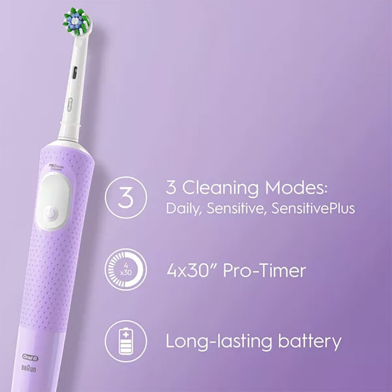 مسواک شارژی اورال بی مدل Vitality Pro با سه برنامه شستشو با حرکت لرزشی و چرخش ۷۶۰۰ دور در دقیقه میتواند دو برابر یک مسواک معمولی دندانها را تمیز کند. این مسواک یک تایمر دو دقیقهای دارد تا پایان مدت زمان استاندارد مسواکزدن را به کاربر اطلاع دهد , چهار تایمر 30 ثانیه ای که دندان ها را به 4 قسمت تقسیم کرده ( فک بالا راست و چپ ) و ( فک پایین راست و چپ ) .