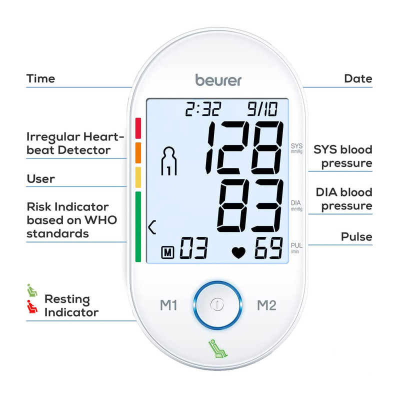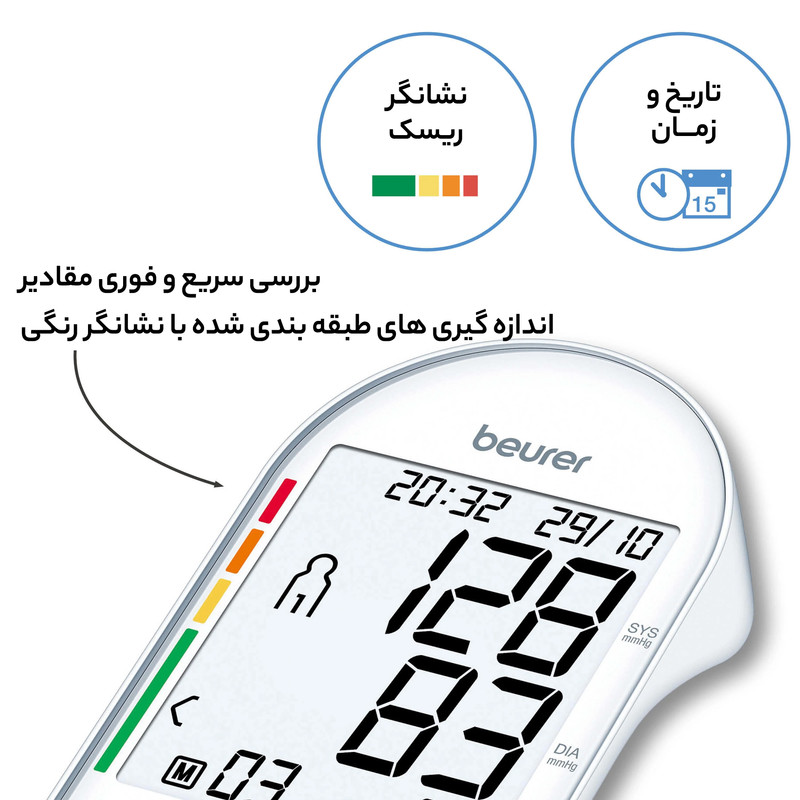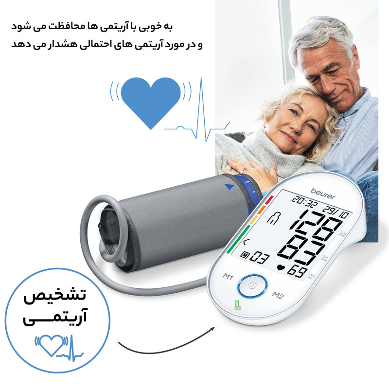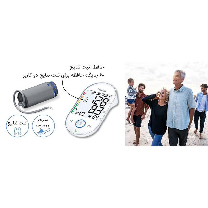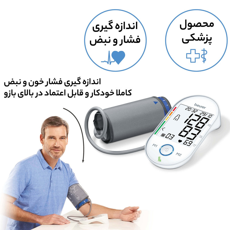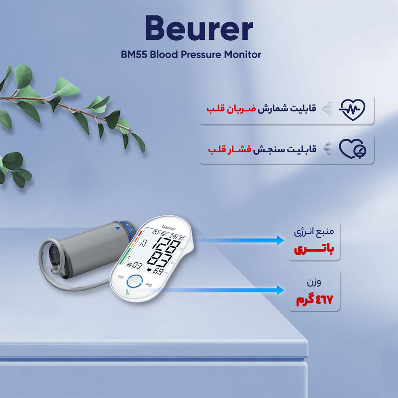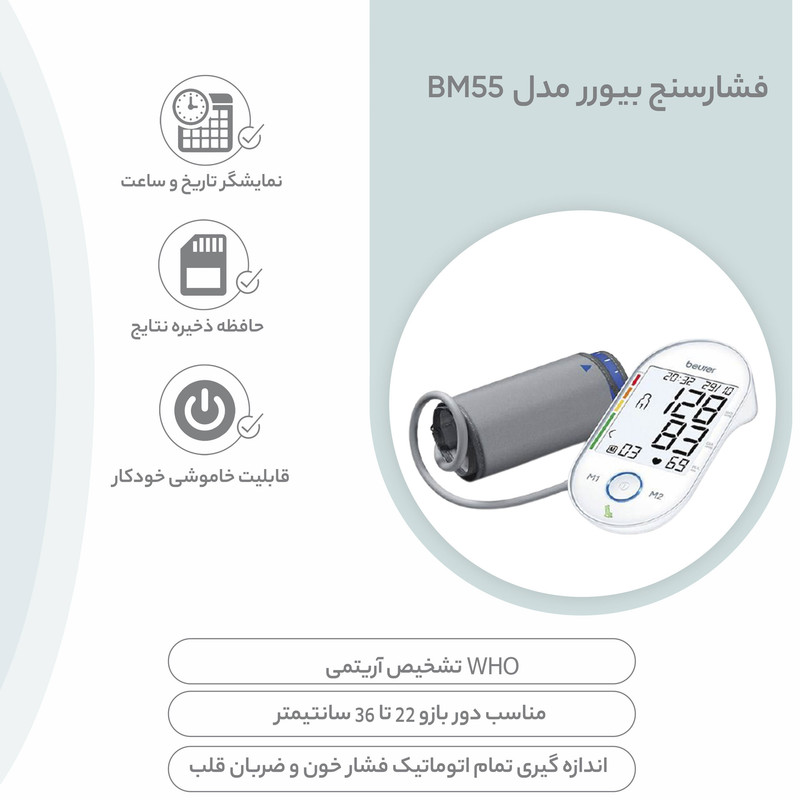 قلب، خون را با فشار زیاد به اندامهای بدن میرساند. اجزای داخلی بدن با جریان داشتن خون در آنها، سالم مانده و به کارکرد طبیعی خود ادامه میدهند. بنابراین میزان فشارخون، یکی از علایم مهم در سلامتی و حیات فرد است. درنتیجه با اندازهگیری آن، میتوانیم اطلاعات مهمی را در مورد وضعیت سلامت فرد به دست آوریم. فشار سنج خانگی BM55 توسط شرکت «بیورر» (Beurer) ساخته شده است. صفحه نمایش بزرگ این دستگاه، خواندن فشار خون را آسانتر میکند. این مدل با استفاده از قابلیت حافظه ذخیره نتایج، میزان فشارخون 2 نفر را در 60 جایگاه حافظه ذخیره میکند. برای ارائه تصویر کلی از وضعیت سلامت فرد، میانگین نتایج، محاسبه و سپس نمایش داده میشود. برای اندازهگیری فشار خون BM55 باید روی بازو در سایزهای 22 تا 36 سانتیمتر بسته شود. از دیگر قابلیتهای این مدل میتوان به سیستم خاموشی خودکار اشاره کرد، بدین معنی که پس از استفاده، این مدل در طی چند ثانیه خاموش میشود. از قابلیتهای پیشرفتهی BM55 میتوان به سنجش ضربان قلب، قابلیت تشخیص آریتمی (ضربان نامنظم قلب) و هشدار خطای محاسباتی اشاره کرد. در نهایت میتوان گفت، BM55 دارای قابلیتهای پیشرفته و مناسب برای مصارف حرفهای است.
