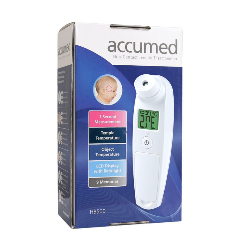 تب سنج دیجیتال اکیومد مدل HB500 دارای 9 حافظه است. به کمک این دستگاه هم درجه حرارت بدن و هم دمای اشیا را میتوان اندازهگیری نمود. این محصول ساخت کشور سوئیس بوده و از کیفیت بالایی برخوردار است. به کمک این دماسنج دیجیتال تنها در عرض 1 ثانیه میتوان به میزان درجه دمای بدن و اشیا پی برد. درجه حرارت دمای بدن انسان در حالت طبیعی حدود 37 درجه سانتیگراد است. این دستگاه مجهز به هشدار تب بالا بوده و در صورتی که حرارت بدن خطرناک باشد، آلارم میدهد. برای اینکه این دستگاه کار کند، هیچ نیازی به تماس با بدن ندارد و این مسئله یکی از مزایای آن محسوب میشوند. چون بسیاری از کودکان دوست ندارند و اجازه نمیدهند تا به کمک تبسنجهای معمولی اقدام به اندازهگیری تب آنها کرد